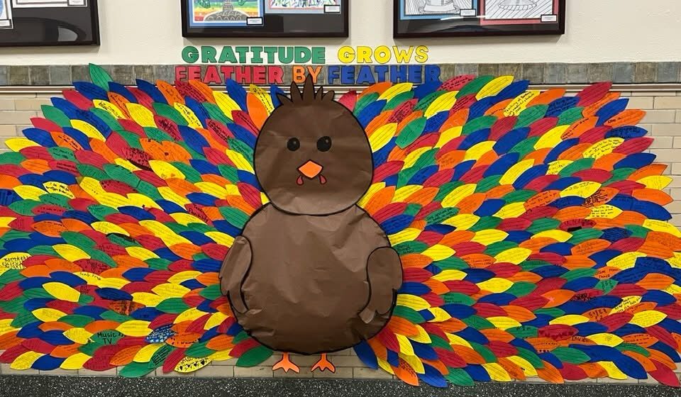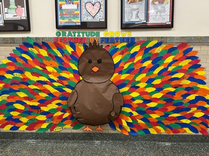 Los estudiantes escribieron algo por lo que están agradecidos en cada pluma de nuestro pavo escolar, creando una colorida exhibición que nos recuerda todas las cosas que tenemos para apreciar.